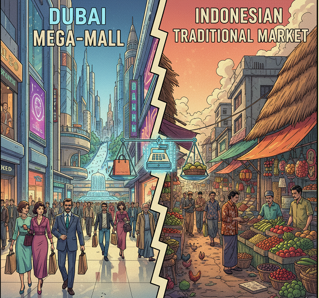 Pentingnya Konteks: Keduanya sama-sama penting bagi ekosistem ekonomi masing-masing. Mal Dubai adalah mesin pertumbuhan PDB non-minyak, sementara pasar tradisional Indonesia adalah mesin kesejahteraan UMKM dan distribusi pangan harian.