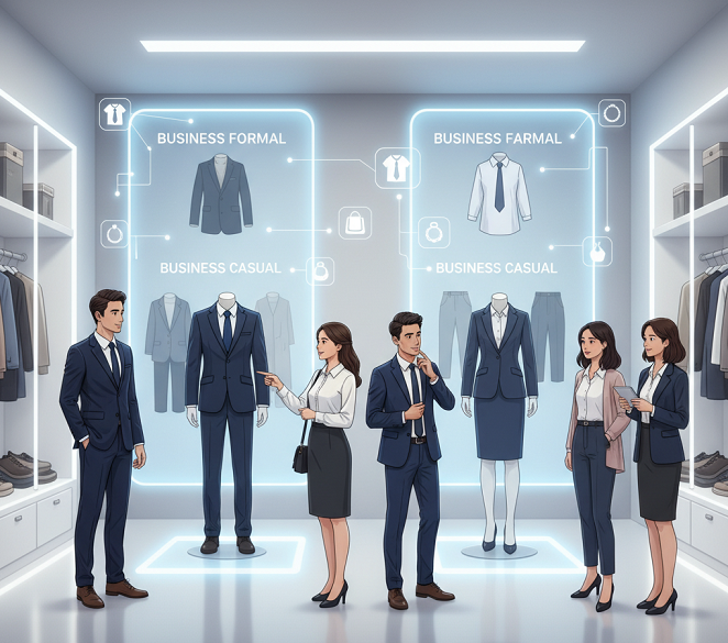 | Business Formal | Profesional | Setelan Jas Lengkap (Gelap), Dasi | Setelan Jas Wanita, Gaun Formal Selutut, Konservatif | Siang Hari Kerja |