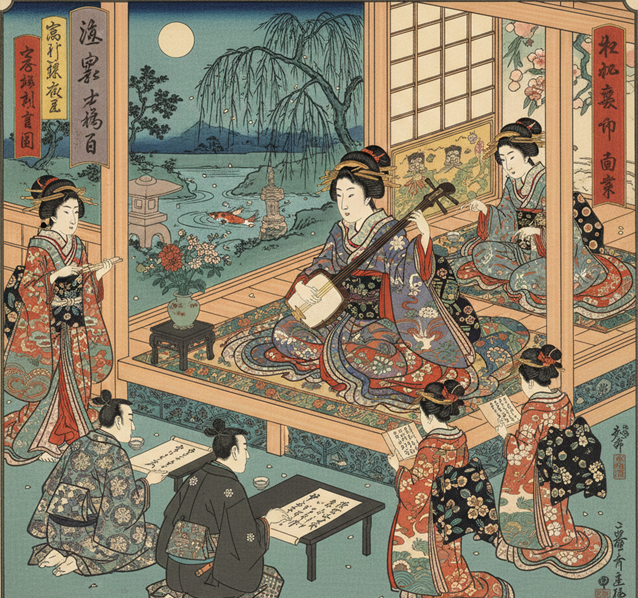 | Permainan Minum | Teka-teki sastra, kutipan teks klasik, dadu. | Mengelola suasana sosial; sarana bagi courtesan untuk menguji pengetahuan tamu. |