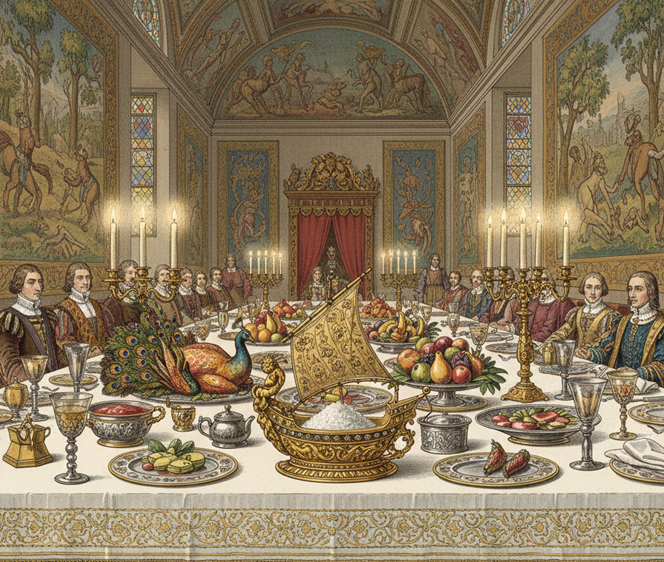 Di dalam istana atau aula besar bangsawan, meja makan diatur sebagai representasi mikrokosmos dari tatanan kosmik dan sosial. Setiap aspek dari penataan meja—mulai dari ketinggian lantai hingga jenis kain yang digunakan—dirancang untuk mempertegas posisi masing-masing individu dalam rantai keberadaan feodal. Ruang perjamuan bukan sekadar tempat makan, melainkan arena di mana loyalitas ditegaskan dan penghinaan diberikan secara halus namun mematikan.